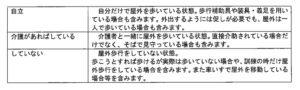 移動:歩行に限らず、居室とトイレの移動や、ベットと車椅子、車椅子と便座等への移乗も含めた